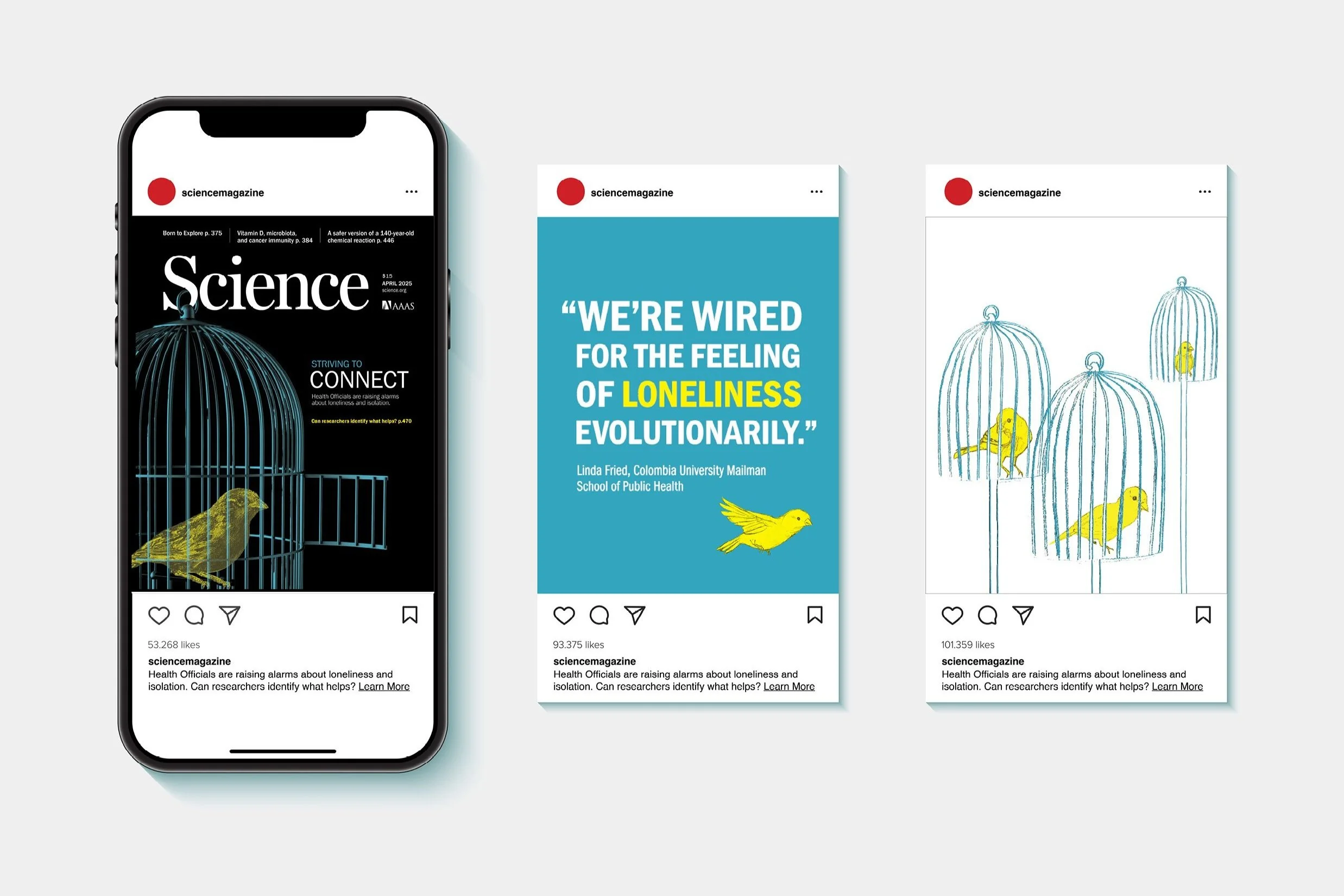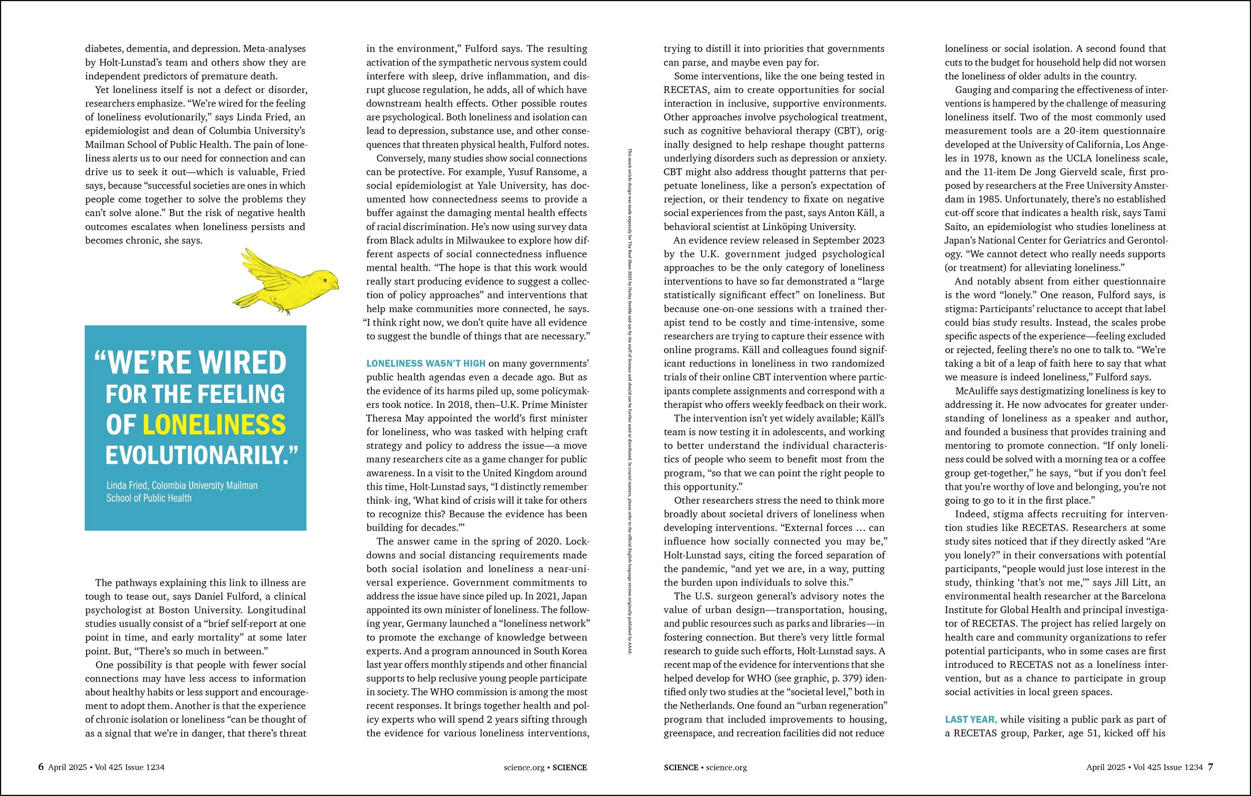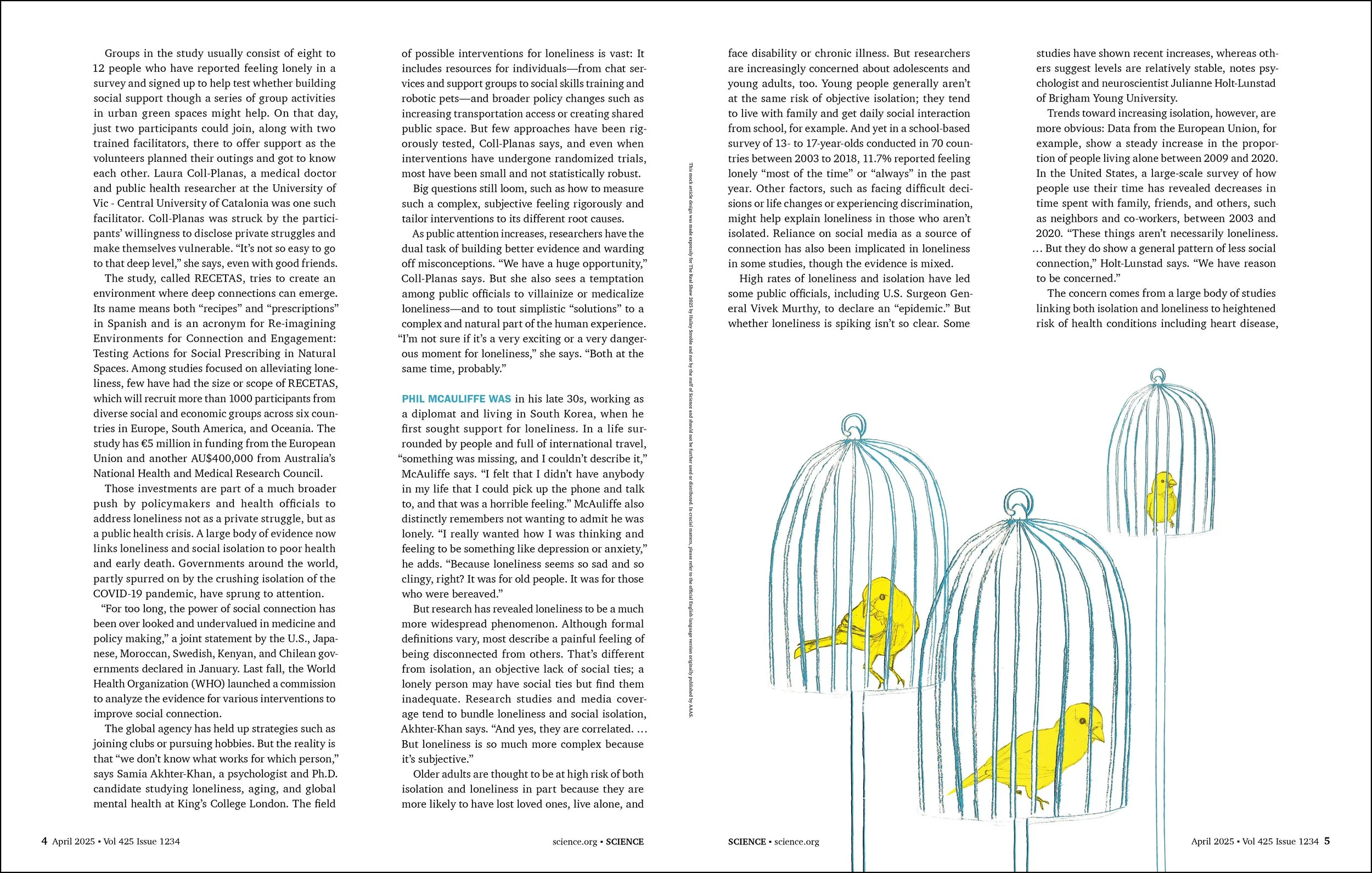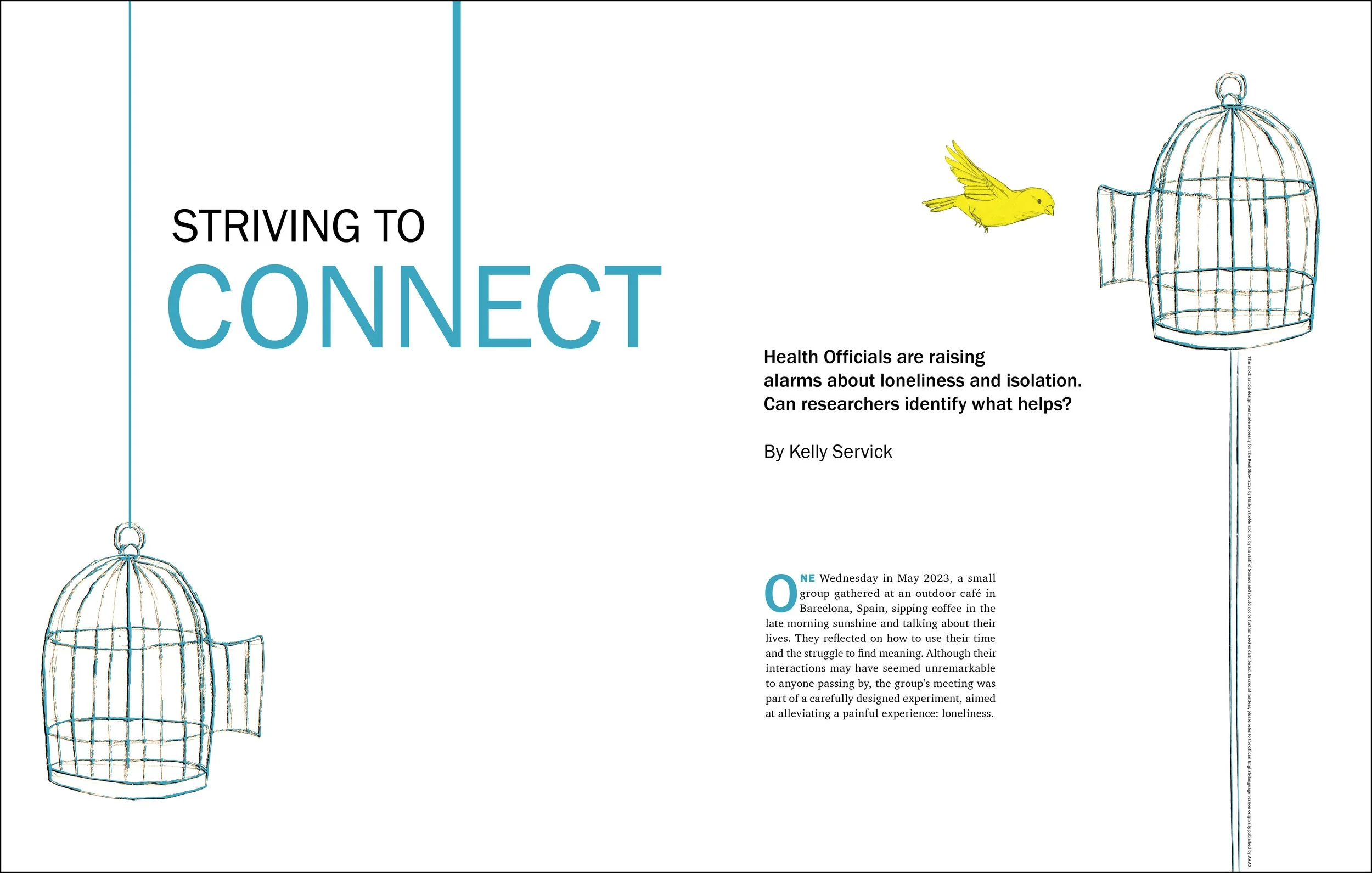 Cover, feature spread, art, and layout for Science Magazine. Created for an article called “Striving to Connect” which is about research on loneliness. It was found that many people intentionally isolate themselves. My design represents this with canaries and birdcages. The door is open with the chance to escape isolation but they choose to be alone. The canaries in the tree are on separate branches, further displaying this concept. Pennsylvania College of Technology, Spring 2025. Granted Award of Excellence in 2025 The Real Show Competition.